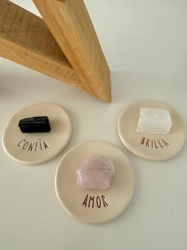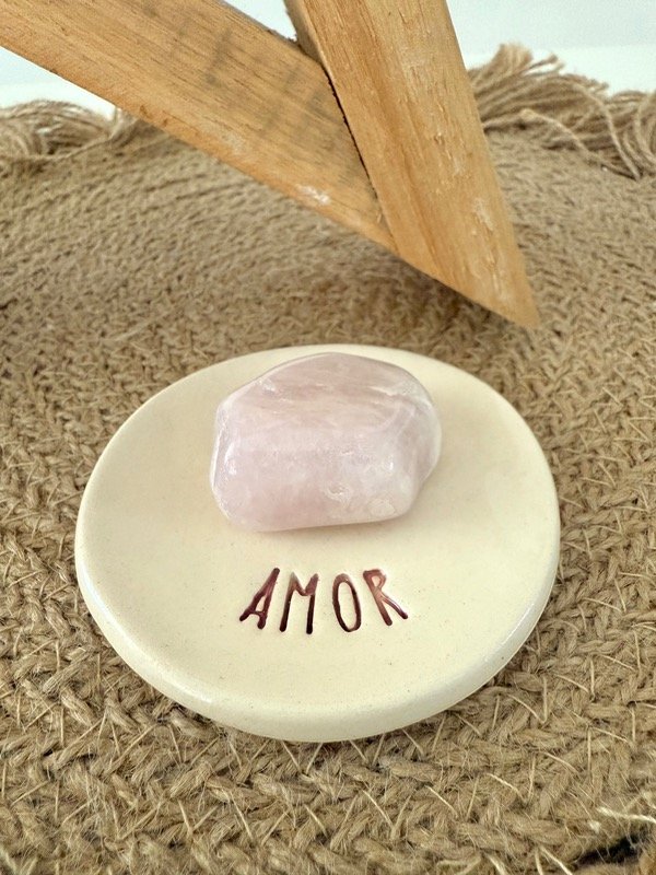 Kit: Platito en cerámica, realizado artesanalmente y pintado a mano con un CUARZO ROSA, con frase "AMOR".