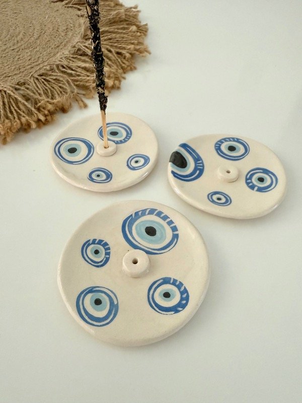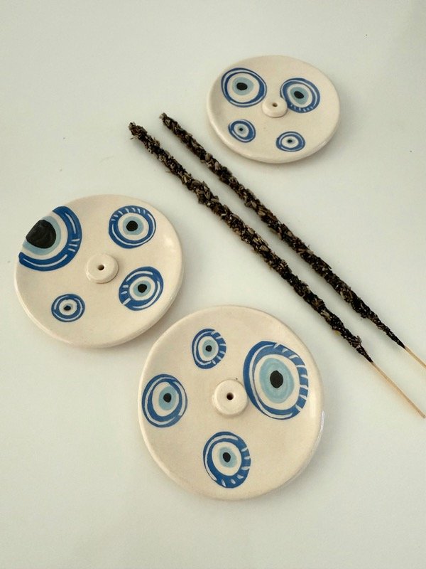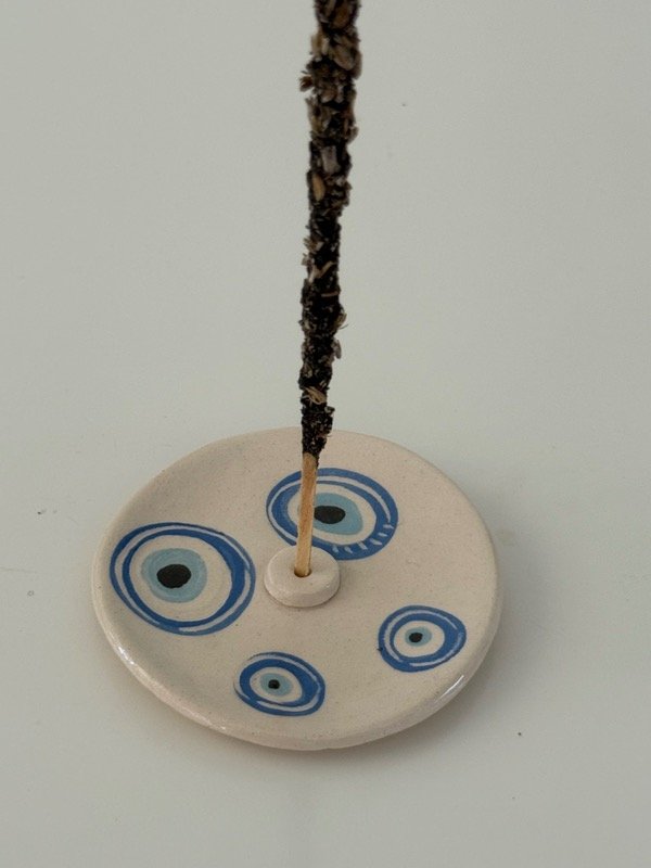 Kit: Porta sahumerio en cerámica, realizado artesanalmente y pintado a mano con el diseño de OJITOS TURCOS y 2 sahumerios artesanales de LAVANDA (relajación) marca AROMANZA.