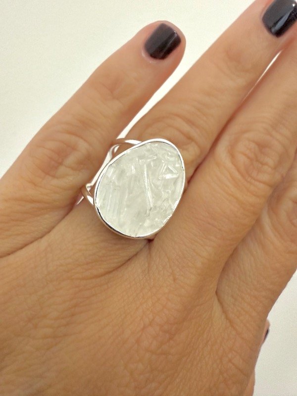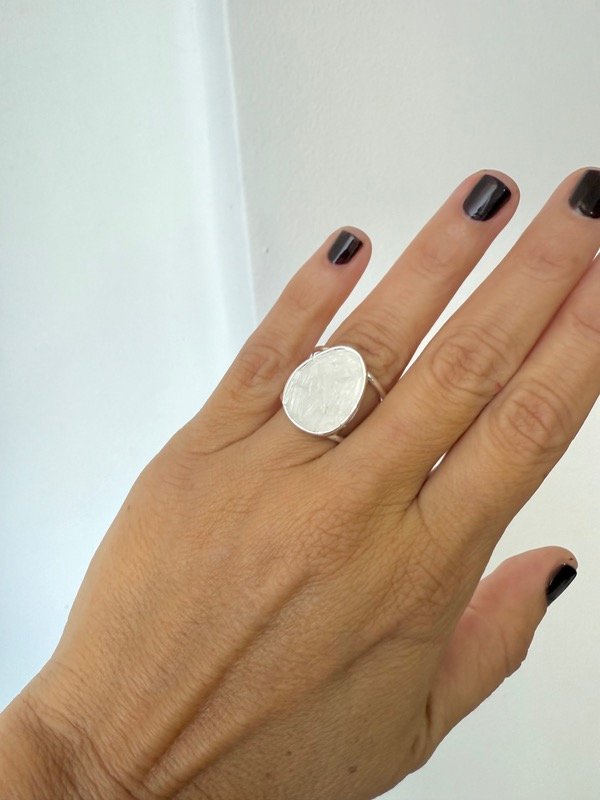 Anillo laminado en plata con una piedra natural central de 1,5 x 2 cm., aprox..