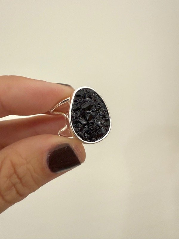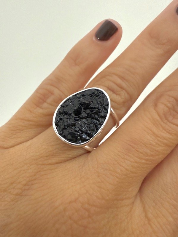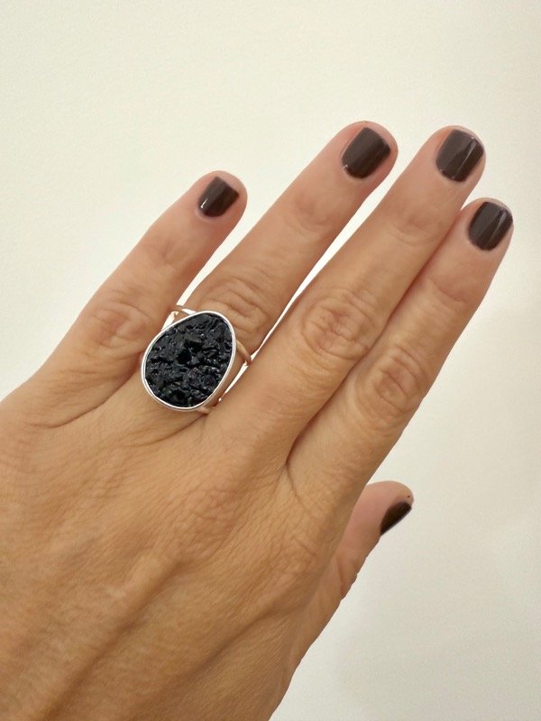 Anillo laminado en plata con una piedra natural central de 1,5 x 2 cm., aprox..