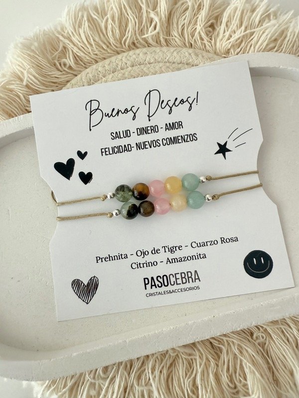 La pulsera BUENOS DESEOS, es de hilo de seda, regulable con 5 cuentas de piedra natural y terminaciones en acero blanco. Apta agua.